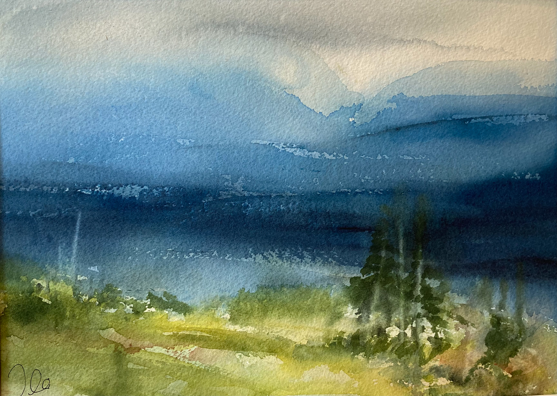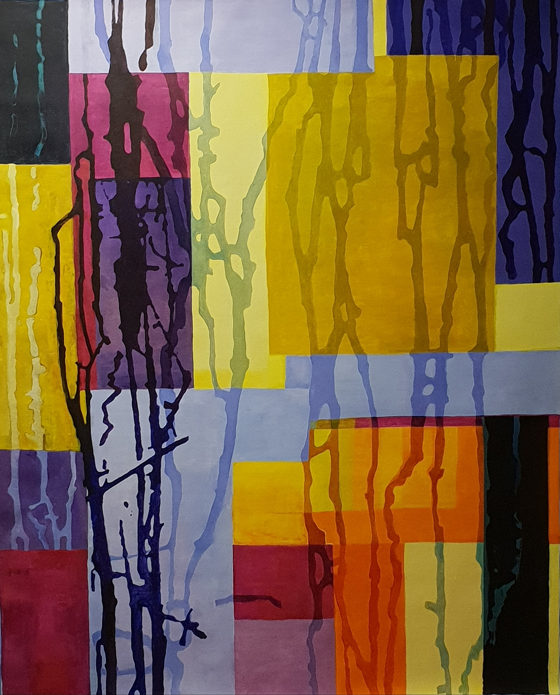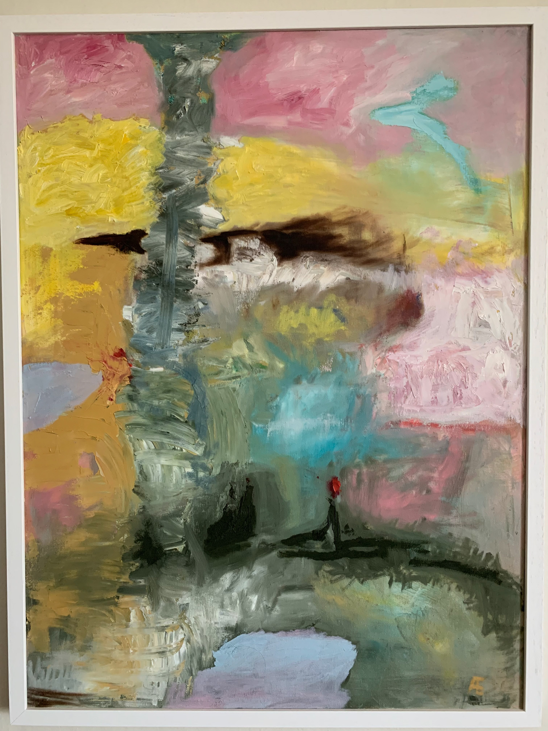 Vid pandemins utbrott fick jag diagnos obotlig cancer och kunde inte genomföra mina stipendieresor till Japan, Paris och Capri. Det fick bli resor i fantasin och ett 60-tal målningar på temat ”Reseminnen – om jag fått resa”. Jag målade som besatt för att hålla mig vid liv. Begränsad av karantän behövde jag hitta nya former, organisera struktur, få balans i livet med nya olika känslomässiga tillstånd. Vattenytas lekfulla rörelser byttes till stramare uttryck.
